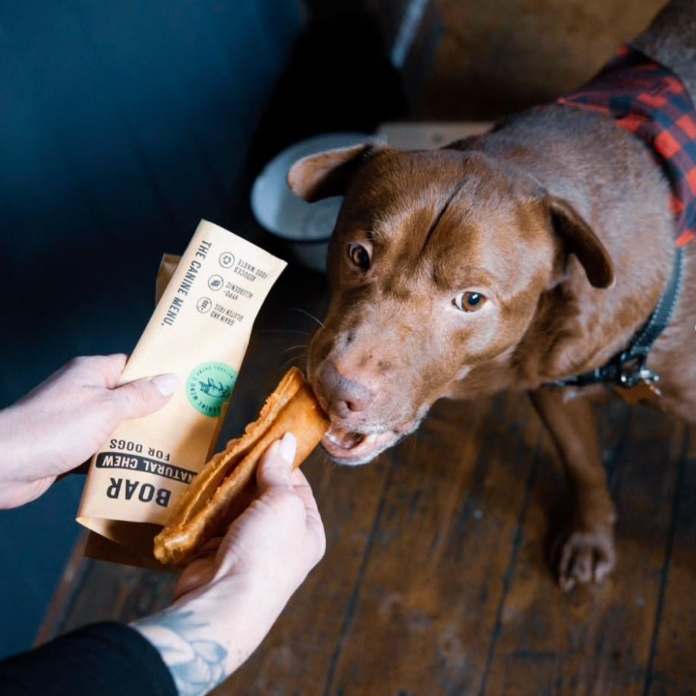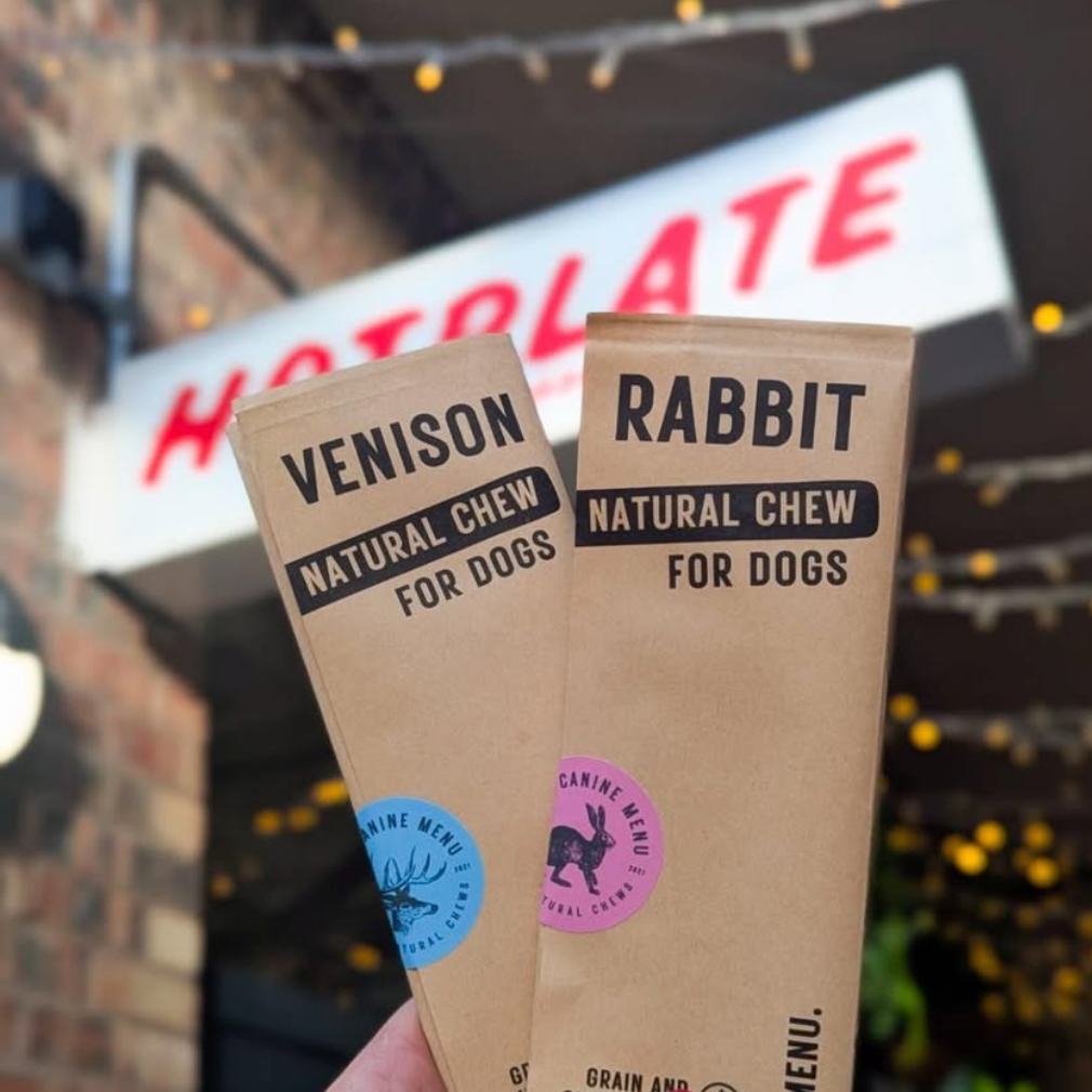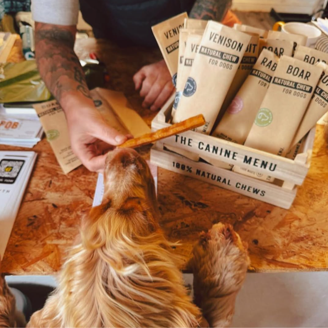 Nous avons fondé The Canine Menu en 2021, après avoir dû apporter des friandises à mâcher pour chien dans notre pub habituel qui accueille les chiens afin de les occuper pendant notre visite. Les biscuits pour chien sur le comptoir étaient une attention appréciable, mais n’occupaient nos chiens qu’une seule fraction de seconde.